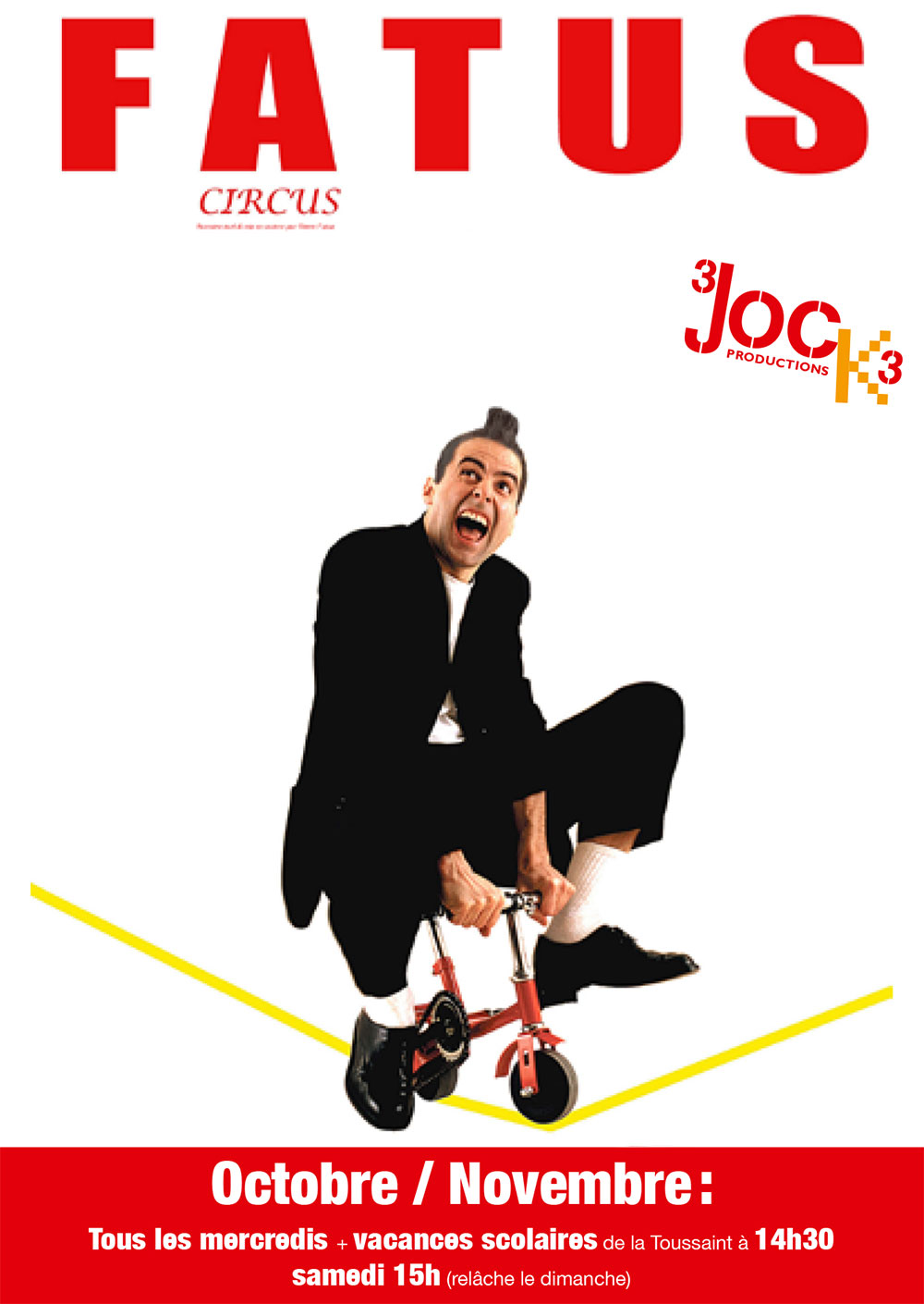 Showman complet, clown contemporain, Fatus dérape... Ici, la ménagerie, c’est lui, et il a tout un big band dans ses valises ! Il mime, danse, jongle, joue de sept instruments, et sort de son chapeau une performance excentrique, un cirque de poche « tout en un » avec pour seul message, la joie ! C’est drôle, visuel et poétique : 45 minutes d’éclats de rire polis par le public des quatre coins du globe.